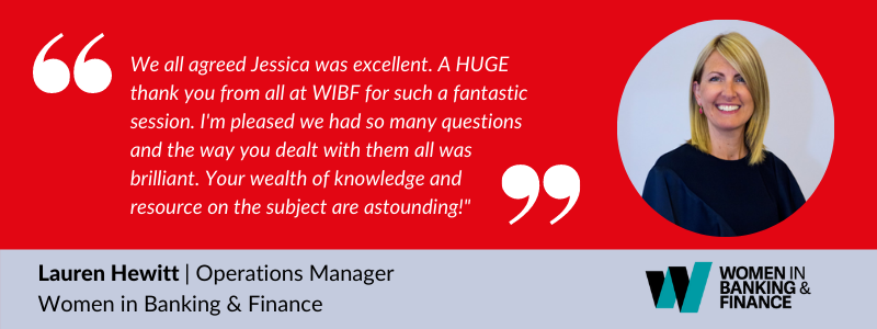 “About your masterclass for the Women in Banking & Finance Personal Excellence Programme, the team here at WIBF and the sponsors at Lloyds Banking Group all agreed it was excellent. The way Jessica dealt with all the questions was brilliant. Her knowledge on the subject is astounding!”